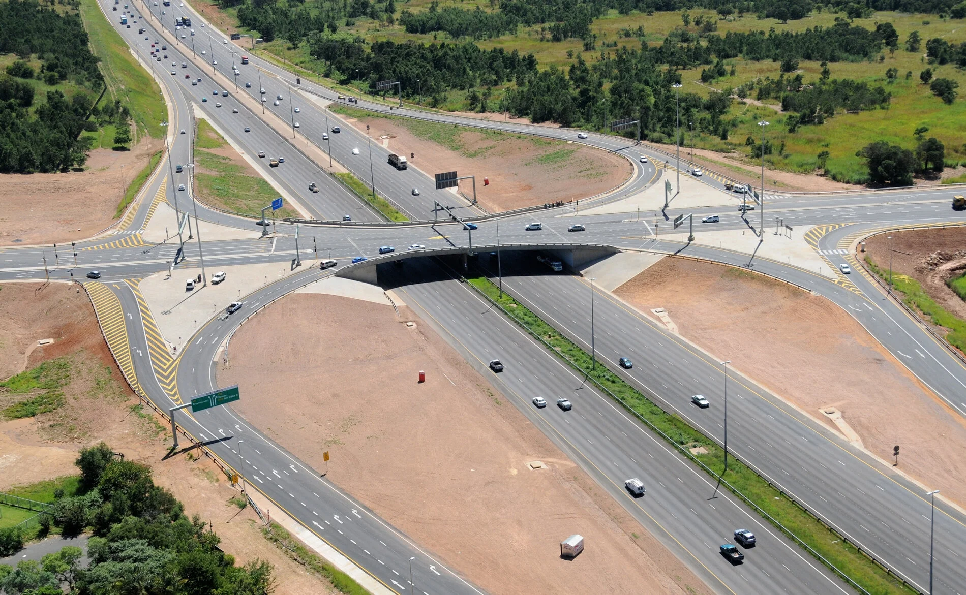 This is a 53m long, two span bridge over the N1 freeway. The original bridge deck was 17.4m wide and the widened deck is 27m wide. 3m wide triangular shaped flares were also added at each of the four corners to facilitate the new single point interchange. The widening incorporated precast concrete U beams in the deck that kept interference with the traffic on the N1 to a minimum during construction.